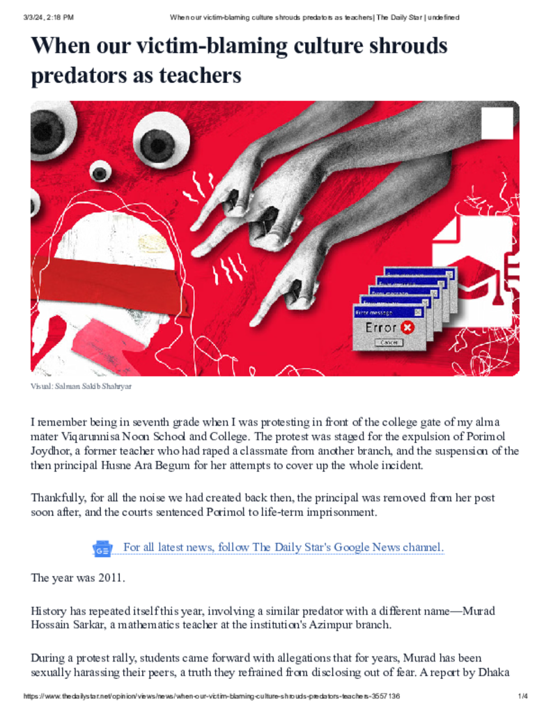 When our victim-blaming culture shrouds predators as teachers_ The Daily Star _ undefined Published on 02 March 2024 Newspaper The Daily Star Category Personal Opinion / Discussion / Commentary Download
