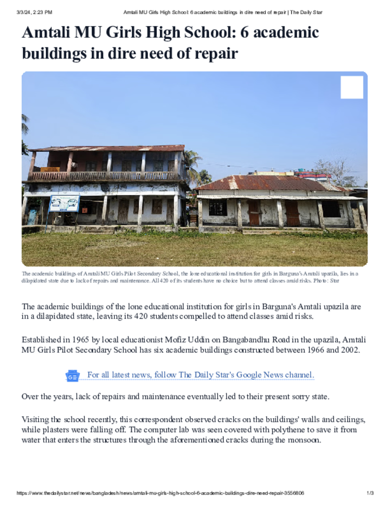 Amtali MU Girls High School_ 6 academic buildings in dire need of repair _ The Daily Star Published on 02 March 2024 Newspaper The Daily Star Category Personal Opinion / Discussion / Commentary Download
