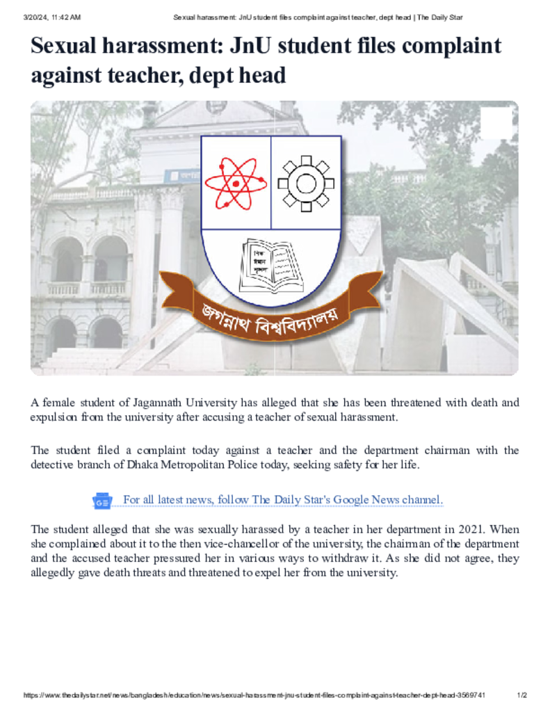 Sexual harassment_ JnU student files complaint against teacher, dept head _ The Daily Star Published on 18 March 2024 Newspaper The Daily Star Category Others General Education Higher Education Public Download