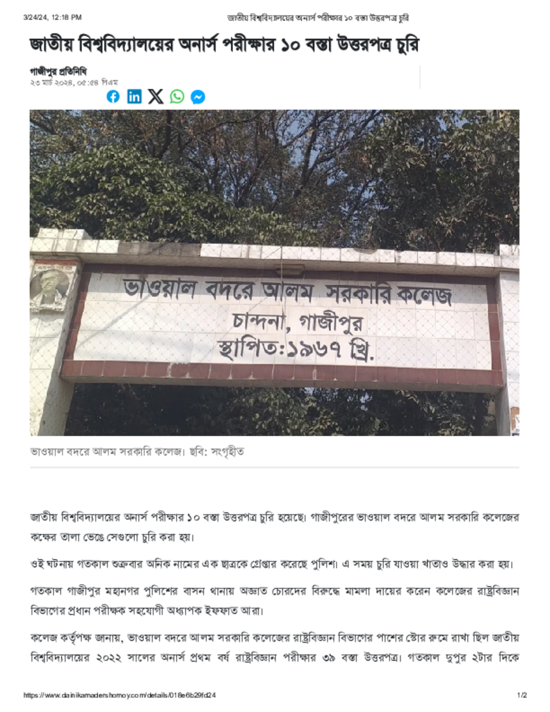 জাতীয় বিশ্ববিদ্যালয়ের অনার্স পরীক্ষার ১০ বস্তা উত্তরপত্র চুরি Published on 23 March 2024 Newspaper দৈনিক আমাদের সময় Category Others General Education Download