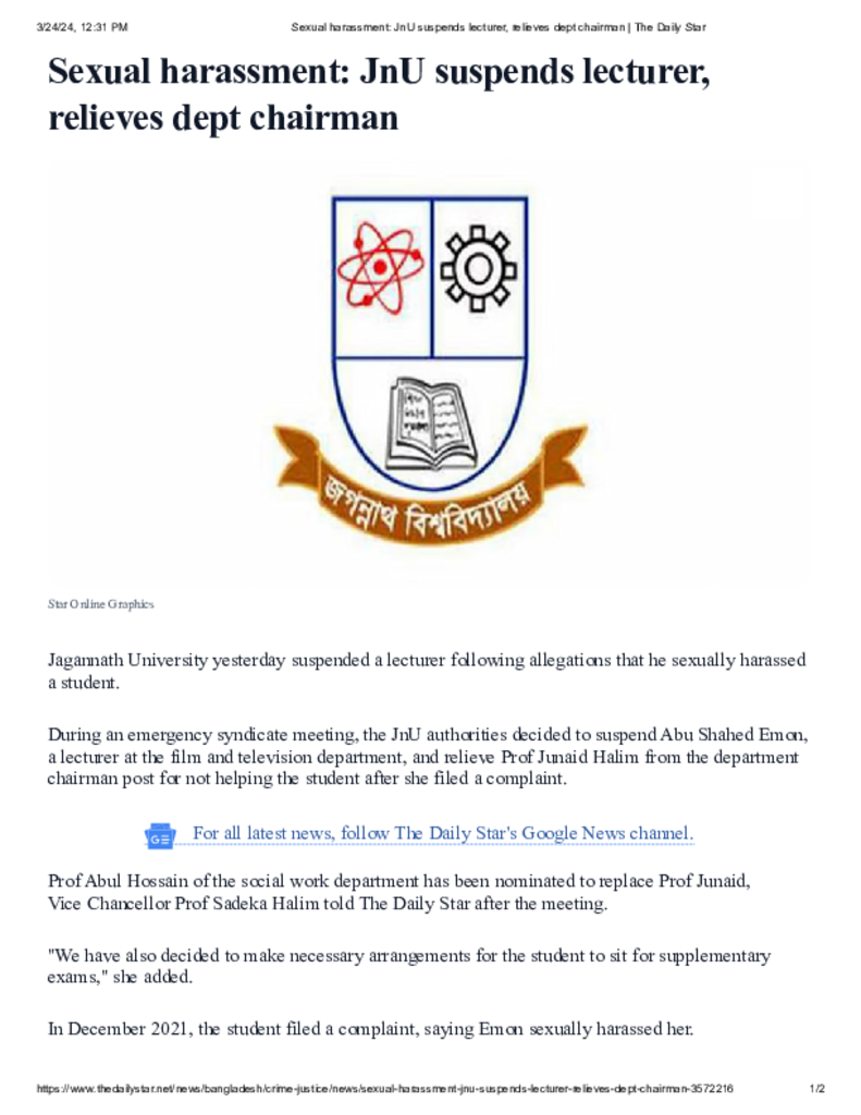 Sexual harassment_ JnU suspends lecturer, relieves dept chairman _ The Daily Star Published on 22 March 2024 Newspaper The Daily Star Category Others General Education Download