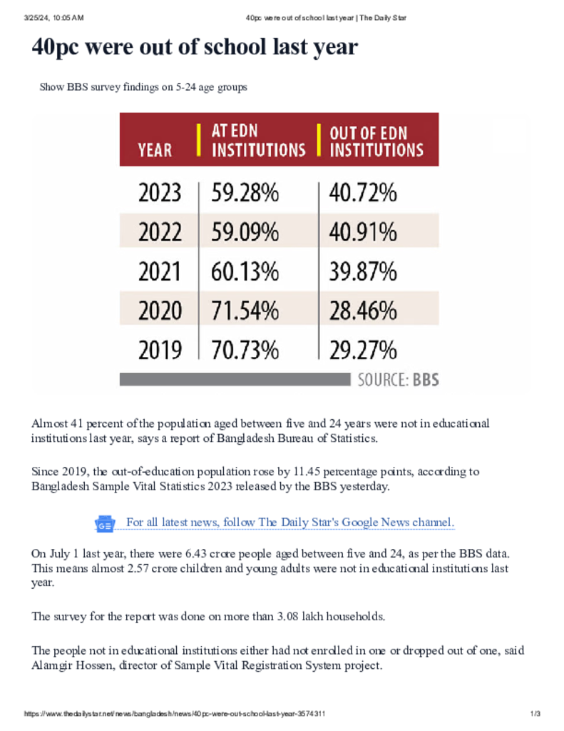 40pc were out of school last year _ The Daily Star Published on 25 March 2024 Newspaper The Daily Star Category Personal Opinion / Discussion / Commentary Download