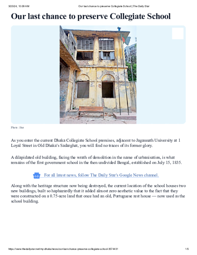 Our last chance to preserve Collegiate School _ The Daily Star Published on 25 March 2024 Newspaper The Daily Star Category Personal Opinion / Discussion / Commentary Download