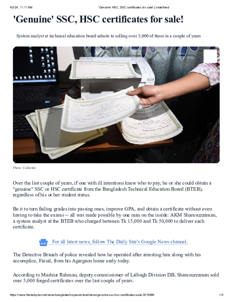 'Genuine' HSC, SSC certificates for sale! _ undefined Published on 02 April 2024 Newspaper The Daily Star Category Others Download