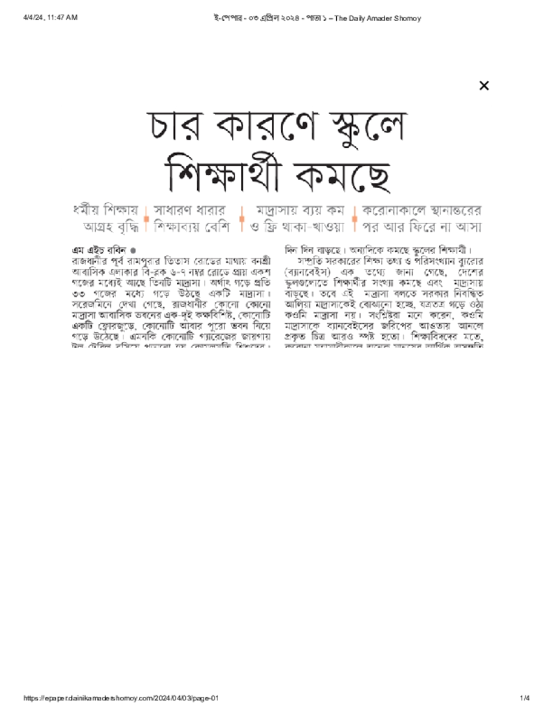 চার কারণে স্কুলে শিক্ষার্থী কমেছে