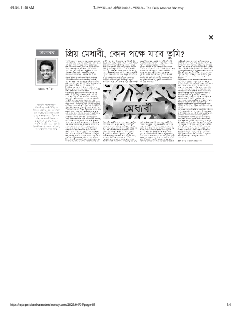 প্রিয় মেধাবী, কোন পক্ষে যাবে তুমি Published on 04 April 2024 Newspaper দৈনিক আমাদের সময় Category Personal Opinion / Discussion / Commentary Download