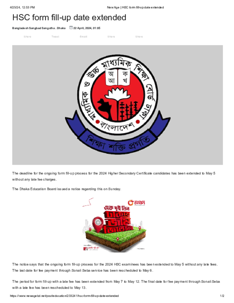 New Age _ HSC form fill-up date extended.pdf Published on 22 April 2024 Newspaper New Age Category Educational Ministry / Departments Public Examination HSC Download