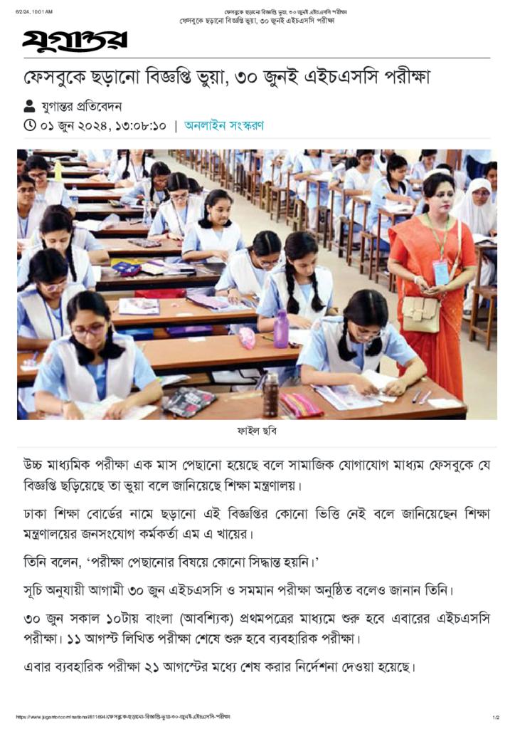 ফেসবুকে ছড়ানো বিজ্ঞপ্তি ভুয়া, ৩০ জুনই এইচএসসি পরীক্ষা.pdf Published on 01 June 2024 Newspaper দৈনিক যুগান্তর Category Educational Ministry / Departments Public Examination HSC Download