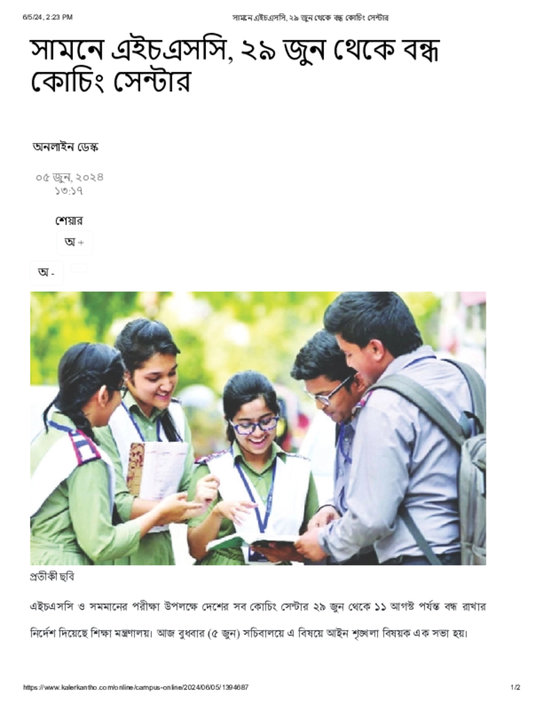সামনে এইচএসসি, ২৯ জুন থেকে বন্ধ কোচিং সেন্টার.pdf Published on 05 June 2024 Newspaper দৈনিক কালের কন্ঠ Category Educational Ministry / Departments Public Examination HSC Download