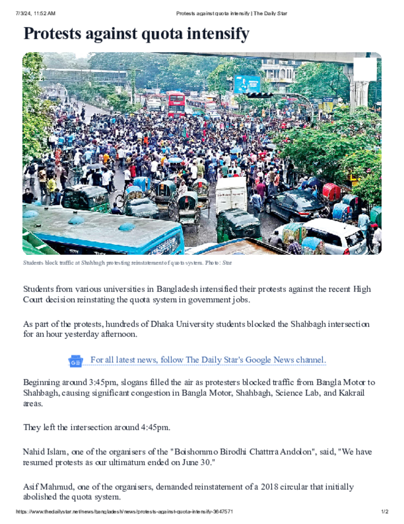 Protests against quota intensify _ The Daily Star.pdf Published on 03 July 2024 Newspaper The Daily Star Category General Education Download