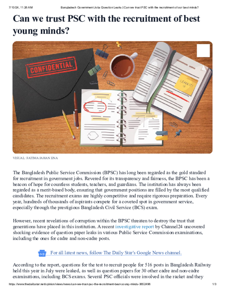 Bangladesh Government Jobs Question Leaks _ Can we trust PSC with the recruitment of our best minds_.pdf Published on 10 July 2024 Newspaper The Daily Star Category General Education Download