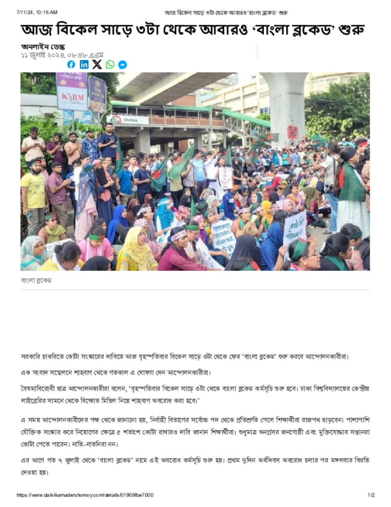 আজ বিকেল সাড়ে ৩টা থেকে আবারও ‘বাংলা ব্লকেড’ শুরু.pdf Published on 11 July 2024 Newspaper দৈনিক আমাদের সময় Category Others General Education Download