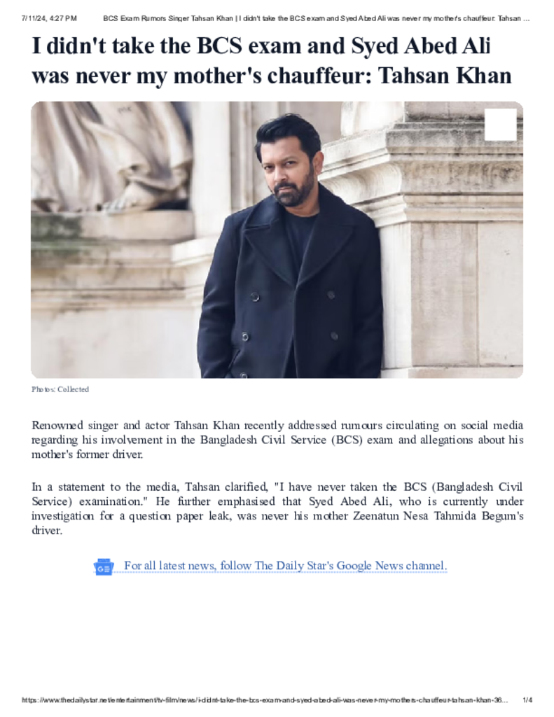 BCS Exam Rumors Singer Tahsan Khan _ I didn't take the BCS exam and Syed Abed Ali was never my mother's chauffeur_ Tahsan Khan.pdf Published on 11 July 2024 Newspaper The Daily Star Category General Education Download