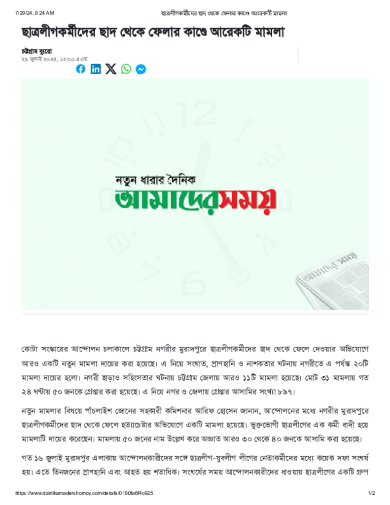 ছাত্রলীগকর্মীদের ছাদ থেকে ফেলার কাণ্ডে আরেকটি মামলা.pdf Published on 29 July 2024 Newspaper দৈনিক আমাদের সময় Category Others General Education Download
