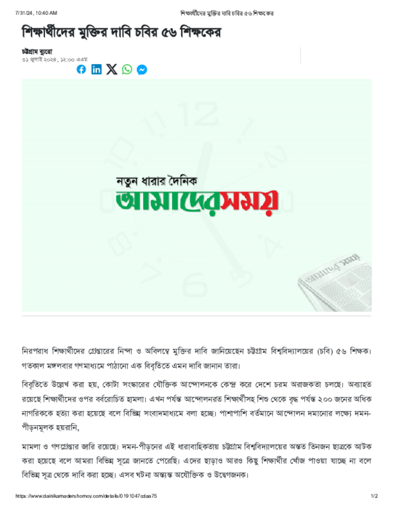 শিক্ষার্থীদের মুক্তির দাবি চবির ৫৬ শিক্ষকের.pdf Published on 31 July 2024 Newspaper দৈনিক আমাদের সময় Category General Education General Education Download
