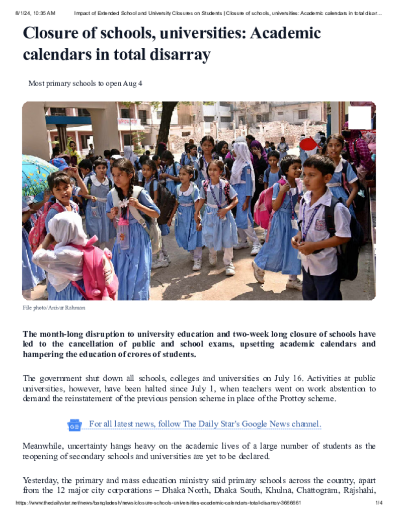 Impact of Extended School and University Closures on Students _ Closure of schools, universities_ Academic calendars in total disarray.pdf Published on 01 August 2024 Newspaper The Daily Star Category General Education Download