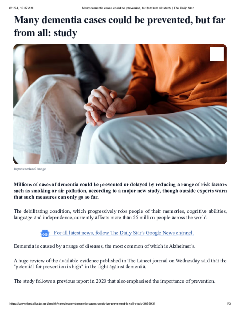 Many dementia cases could be prevented, but far from all_ study _ The Daily Star.pdf Published on 01 August 2024 Newspaper The Daily Star Category Others Download