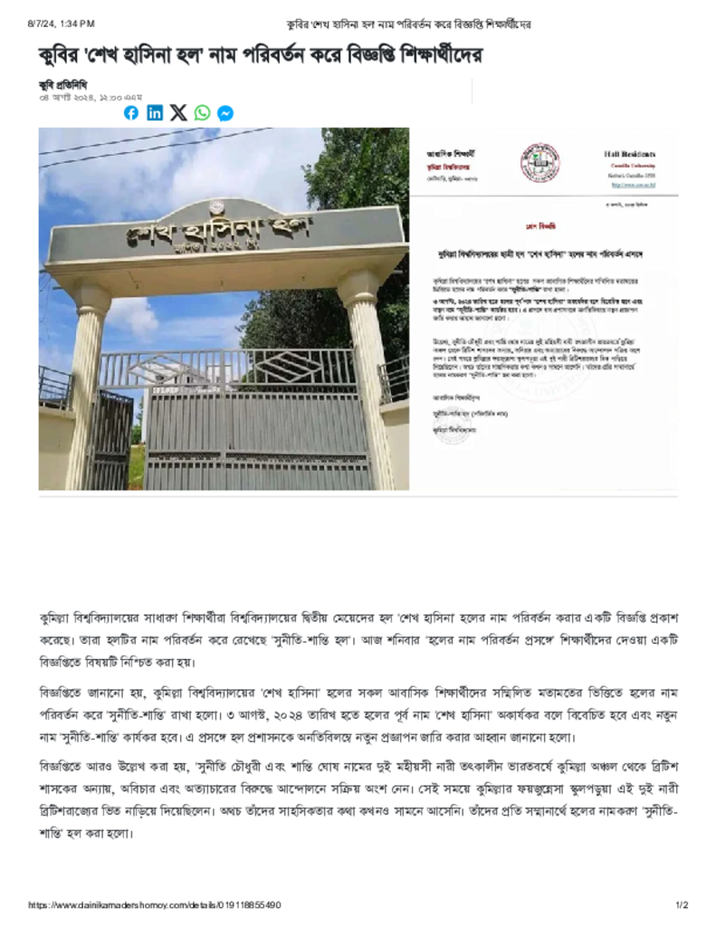 কুবির 'শেখ হাসিনা হল' নাম পরিবর্তন করে বিজ্ঞপ্তি শিক্ষার্থীদের.pdf Published on 04 August 2024 Newspaper দৈনিক আমাদের সময় Category General Education General Education Higher Education Public Download
