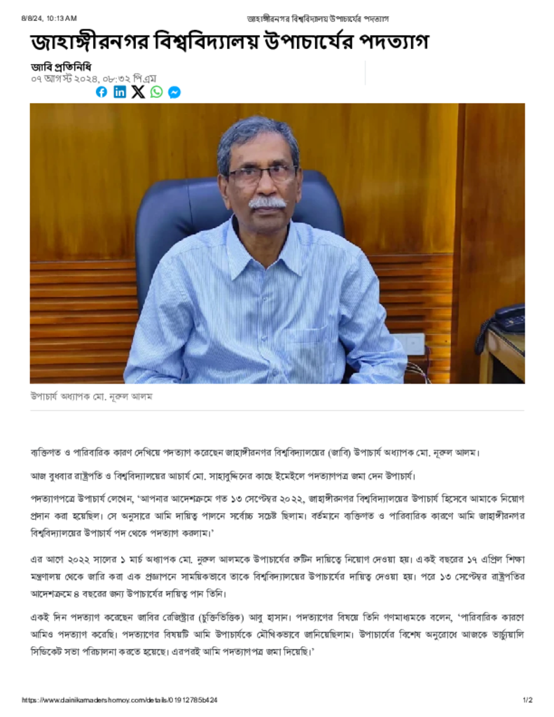 জাহাঙ্গীরনগর বিশ্ববিদ্যালয় উপাচার্যের পদত্যাগ.pdf Published on 07 August 2024 Newspaper দৈনিক আমাদের সময় Category General Education General Education Higher Education Public Download