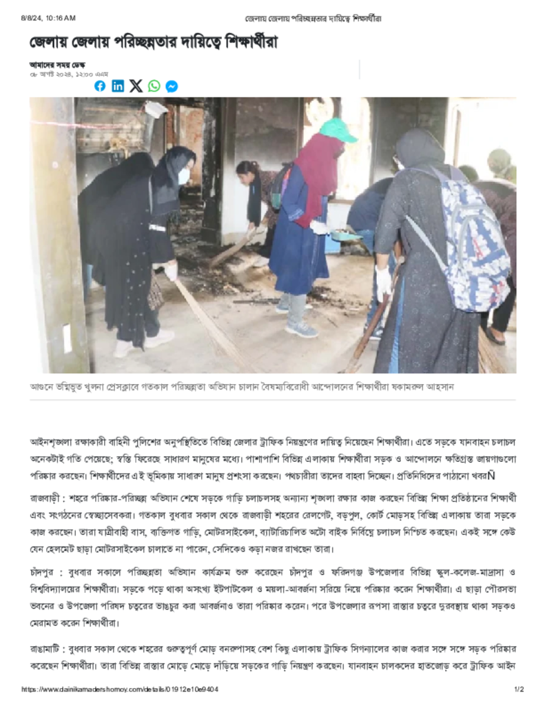 জেলায় জেলায় পরিচ্ছন্নতার দায়িত্বে শিক্ষার্থীরা.pdf Published on 08 August 2024 Newspaper দৈনিক আমাদের সময় Category Others Download