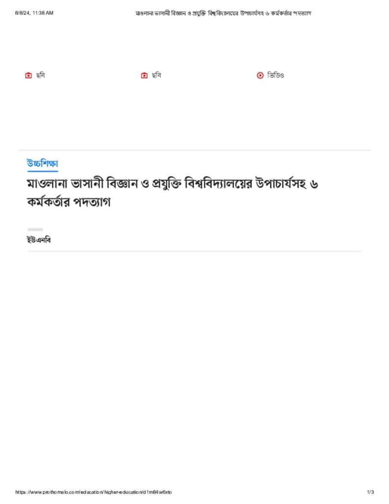 মাওলানা ভাসানী বিজ্ঞান ও প্রযুক্তি বিশ্ববিদ্যালয়ের উপাচার্যসহ ৬ কর্মকর্তার পদত্যাগ.pdf Published on 08 August 2024 Newspaper দৈনিক প্রথম আলো Category General Education General Education Higher Education Public Download