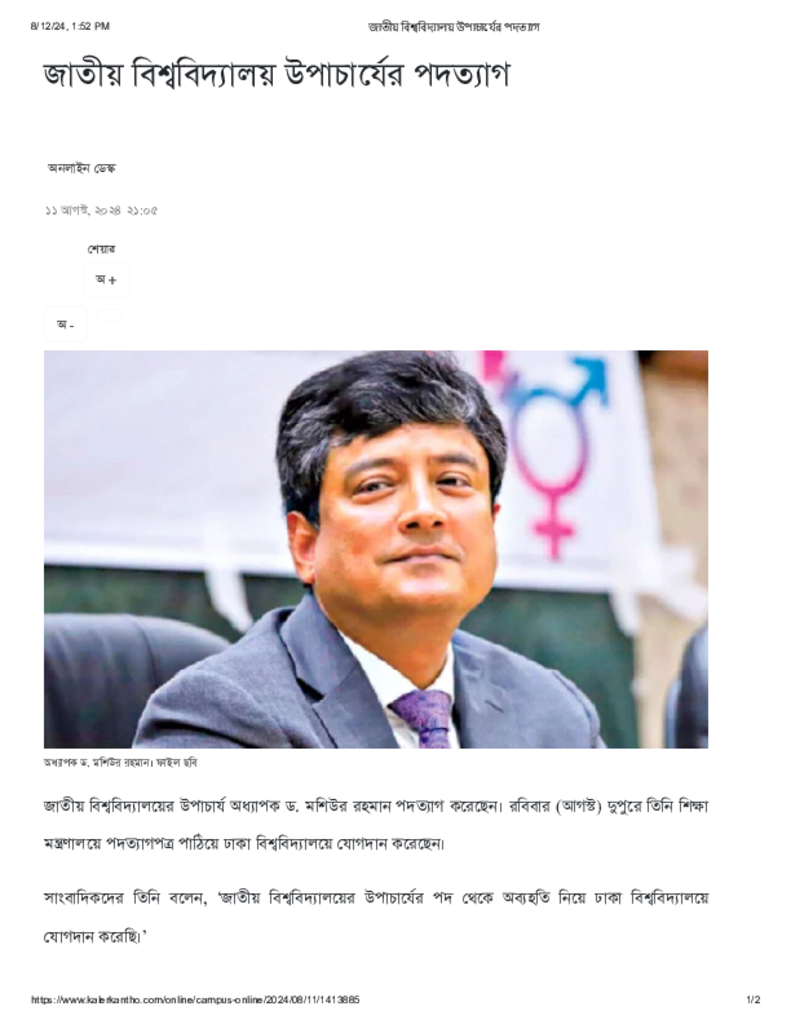 জাতীয় বিশ্ববিদ্যালয় উপাচার্যের পদত্যাগ.pdf Published on 11 August 2024 Newspaper দৈনিক কালের কন্ঠ Category General Education General Education Higher Education Public Download