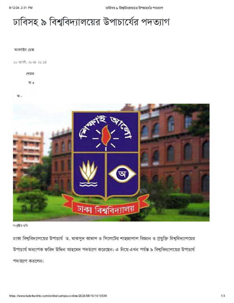 ঢাবিসহ ৯ বিশ্ববিদ্যালয়ের উপাচার্যের পদত্যাগ.pdf Published on 10 August 2024 Newspaper দৈনিক কালের কন্ঠ Category General Education General Education Higher Education Public Download