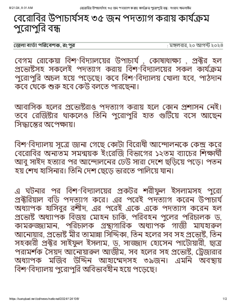 বেরোবির উপাচার্যসহ ৩৫ জন পদত্যাগ করায় কার্যক্রম পুরোপুরি বন্ধ _ সংবাদ অনলাইন.pdf Published on 20 August 2024 Newspaper দৈনিক সংবাদ Category General Education General Education Higher Education Public Download