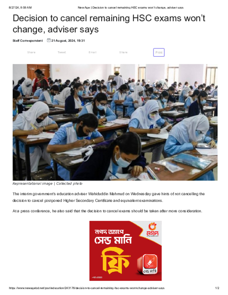 Decision to cancel remaining HSC exams won’t change, adviser says Published on 21 August 2024 Newspaper New Age Category Educational Ministry / Departments Public Examination HSC Download
