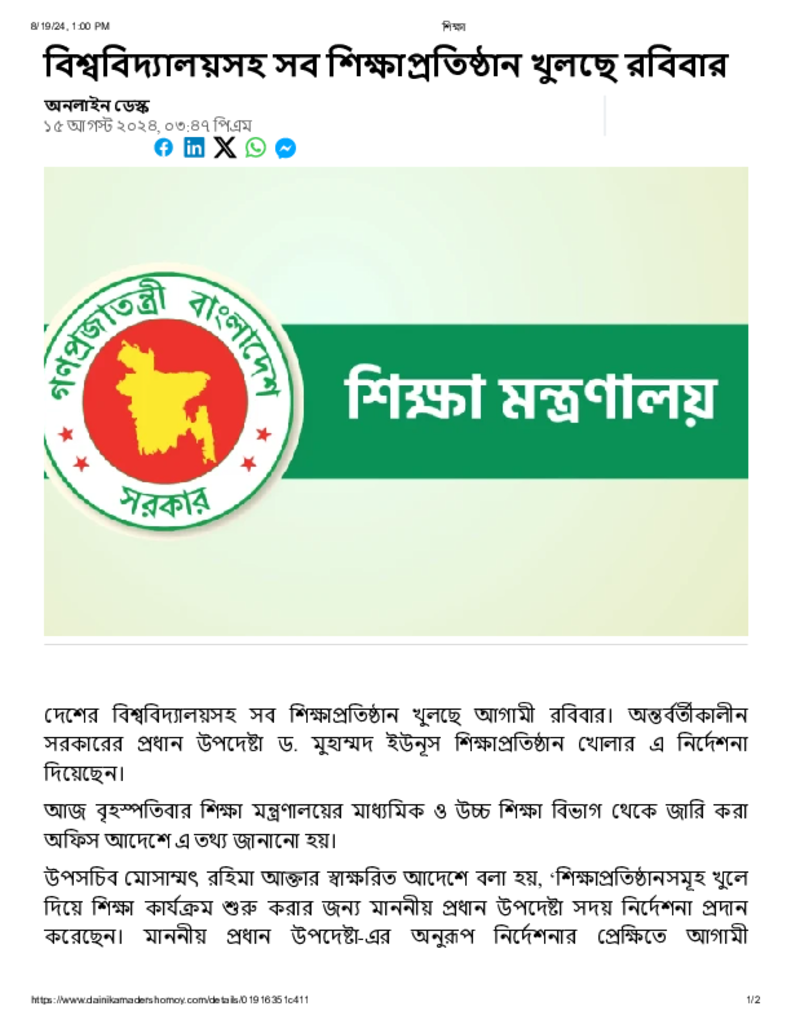 বিশ্ববিদ্যালয়সহ সব শিক্ষাপ্রতিষ্ঠান খুলছে রবিবার.pdf Published on 15 August 2024 Newspaper দৈনিক আমাদের সময় Category Educational Ministry / Departments Download