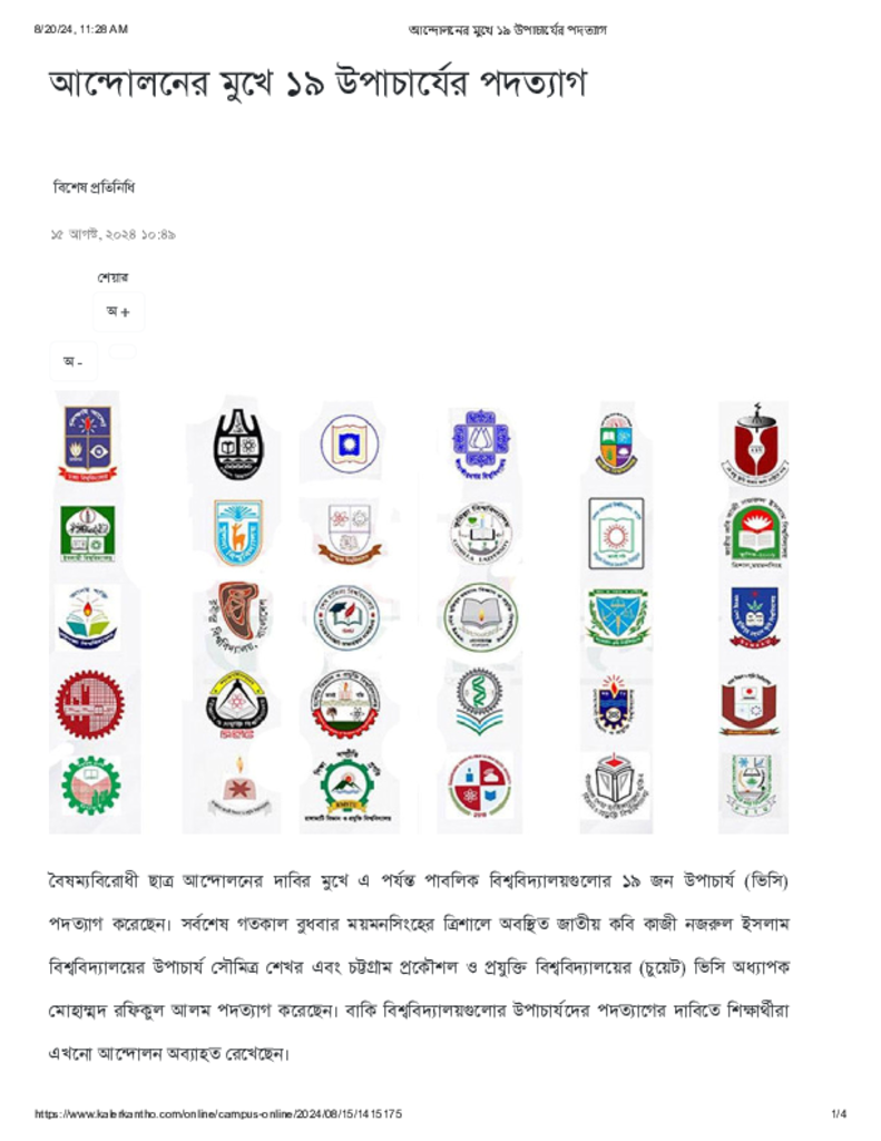 আন্দোলনের মুখে ১৯ উপাচার্যের পদত্যাগ.pdf Published on 15 August 2024 Newspaper দৈনিক কালের কন্ঠ Category General Education General Education Higher Education Public Download