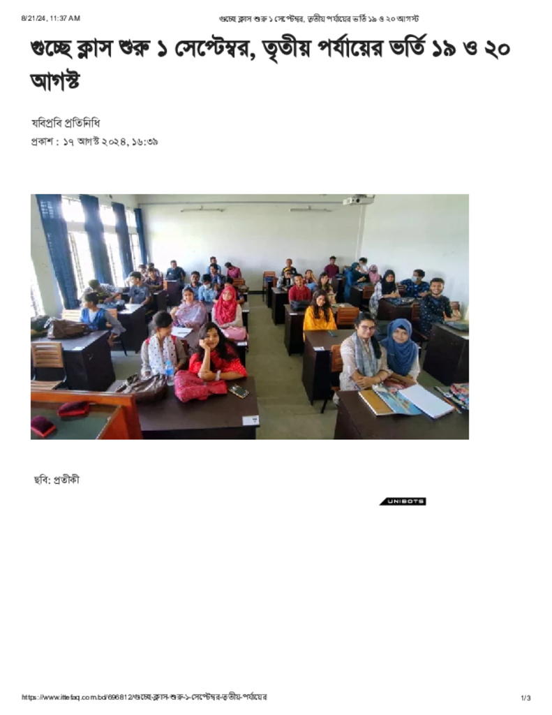 গুচ্ছে ক্লাস শুরু ১ সেপ্টেম্বর, তৃতীয় পর্যায়ের ভর্তি ১৯ ও ২০ আগস্ট.pdf Published on 17 August 2024 Newspaper দৈনিক ইত্তেফাক Category Admission / Seat Problem General Education Higher Education Public Download