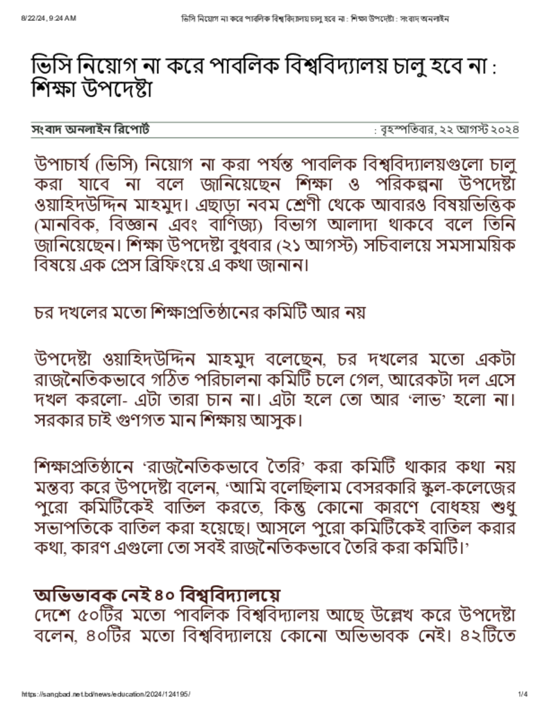 ভিসি নিয়োগ না করে পাবলিক বিশ্ববিদ্যালয় চালু হবে না _ শিক্ষা উপদেষ্টা.pdf Published on 22 August 2024 Newspaper দৈনিক সংবাদ Category Educational Ministry / Departments General Education Higher Education Public Download