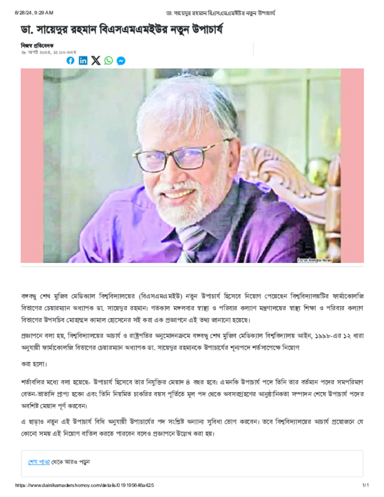 ডা. সায়েদুর রহমান বিএসএমএমইউর নতুন উপাচার্য.pdf Published on 28 August 2024 Newspaper দৈনিক আমাদের সময় Category Professional Education Professional Education Medical Download