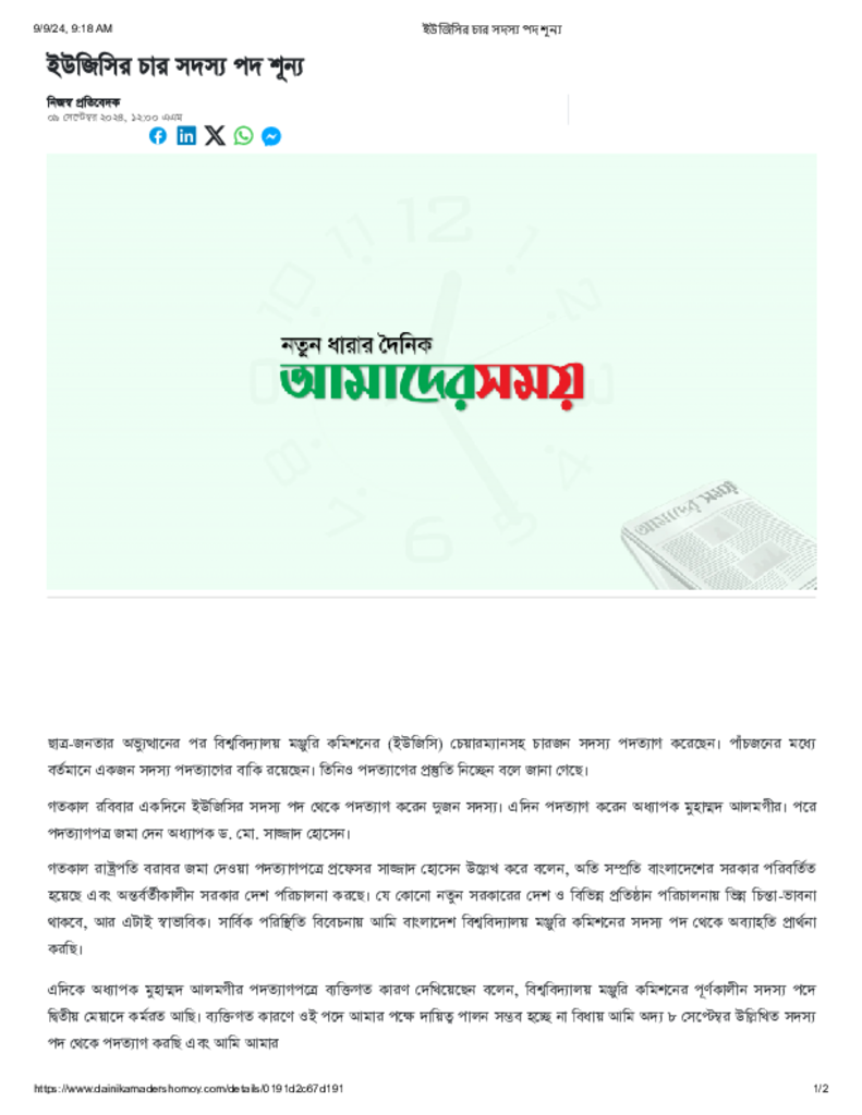 ইউজিসির চার সদস্য পদ শূন্য.pdf Published on 09 September 2024 Newspaper দৈনিক আমাদের সময় Category Educational Ministry / Departments General Education Download