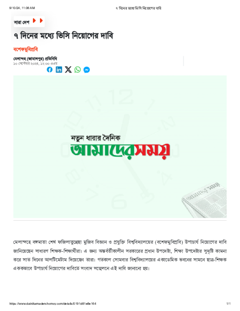 ৭ দিনের মধ্যে ভিসি নিয়োগের দাবি.pdf Published on 10 September 2024 Newspaper দৈনিক আমাদের সময় Category Educational Ministry / Departments General Education Higher Education Public Download