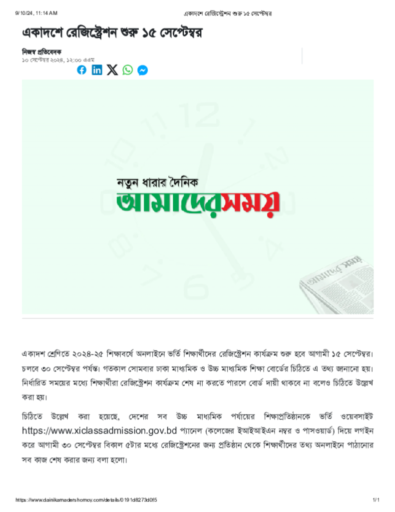 একাদশে রেজিস্ট্রেশন শুরু ১৫ সেপ্টেম্বর.pdf Published on 10 September 2024 Newspaper দৈনিক আমাদের সময় Category Admission / Seat Problem General Education Download