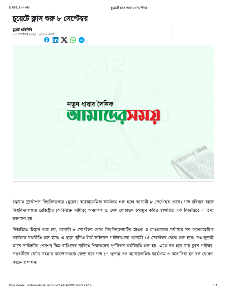 চুয়েটে ক্লাস শুরু ৮ সেপ্টেম্বর.pdf Published on 03 September 2024 Newspaper দৈনিক আমাদের সময় Category Professional Education Professional Education Engineering Download