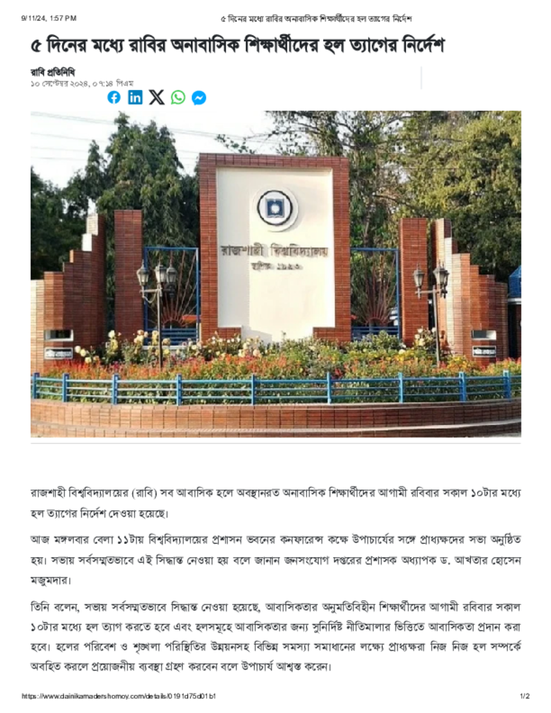 ৫ দিনের মধ্যে রাবির অনাবাসিক শিক্ষার্থীদের হল ত্যাগের নির্দেশ.pdf Published on 10 September 2024 Newspaper দৈনিক আমাদের সময় Category Admission / Seat Problem General Education Higher Education Public Download