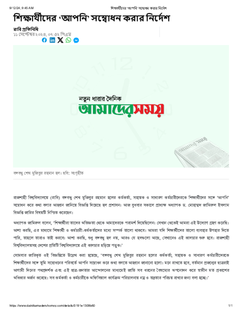 শিক্ষার্থীদের ‘আপনি’ সম্বোধন করার নির্দেশ.pdf Published on 11 September 2024 Newspaper দৈনিক আমাদের সময় Category Personal Opinion / Discussion / Commentary Download