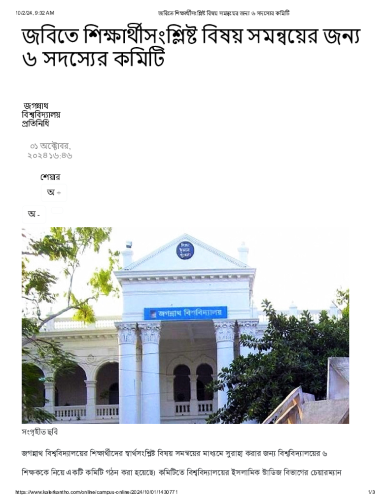 জবিতে শিক্ষার্থীসংশ্লিষ্ট বিষয় সমন্বয়ের জন্য ৬ সদস্যের কমিটি.pdf Published on 01 October 2024 Newspaper দৈনিক কালের কন্ঠ Category General Education General Education Higher Education Public Download