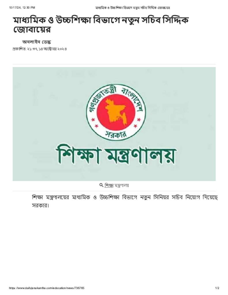 মাধ্যমিক ও উচ্চশিক্ষা বিভাগে নতুন সচিব সিদ্দিক জোবায়ের.pdf Published on 14 October 2024 Newspaper দৈনিক জনকণ্ঠ Category Educational Ministry / Departments General Education Download