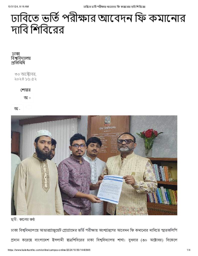 ঢাবিতে ভর্তি পরীক্ষার আবেদন ফি কমানোর দাবি শিবিরের.pdf Published on 30 October 2024 Newspaper দৈনিক কালের কন্ঠ Category Personal Opinion / Discussion / Commentary General Education Higher Education Public Download
