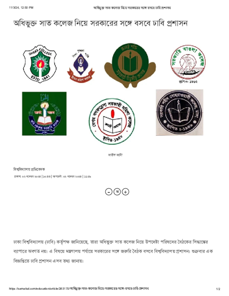 অধিভুক্ত সাত কলেজ নিয়ে সরকারের সঙ্গে বসবে ঢাবি প্রশাসন.pdf Published on 02 November 2024 Newspaper দৈনিক সমকাল Category General Education General Education Higher Education Public Download