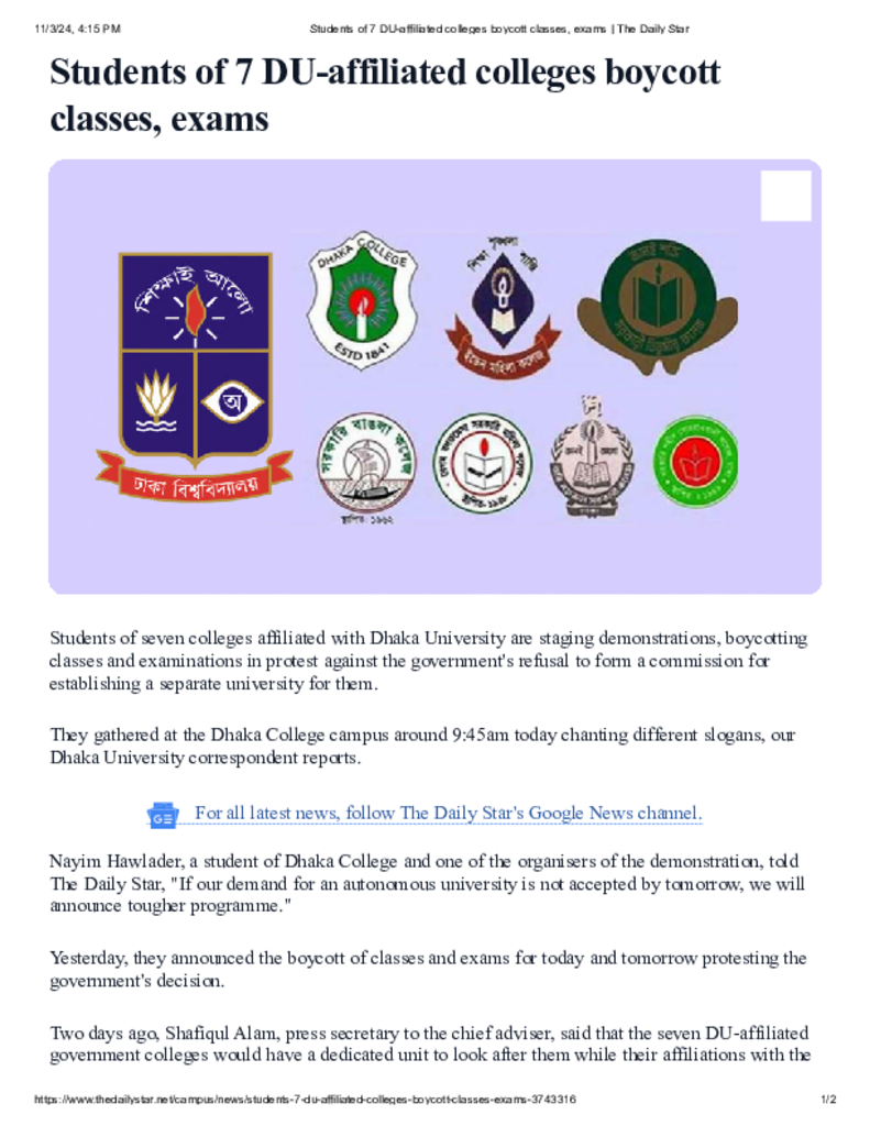 Students of 7 DU-affiliated colleges boycott classes, exams _ The Daily Star.pdf Published on 03 November 2024 Newspaper The Daily Star Category General Education General Education Download