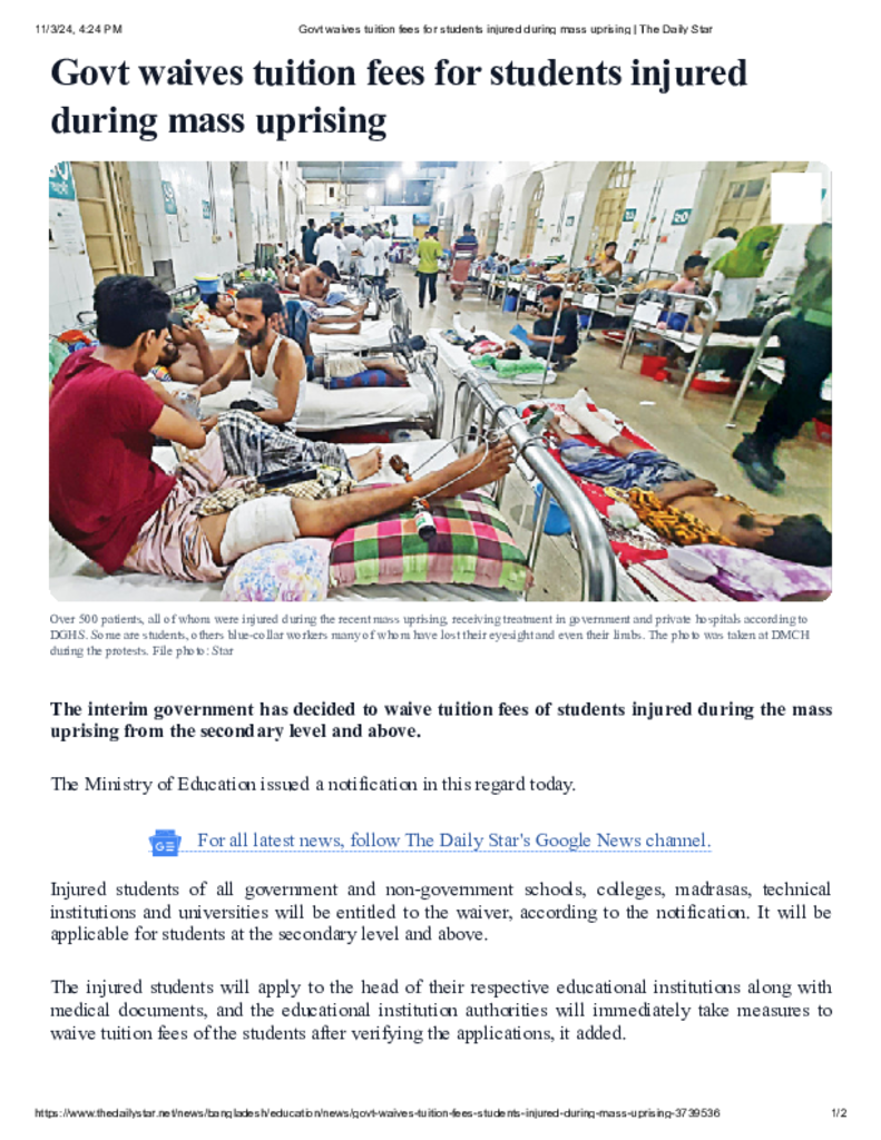 Govt waives tuition fees for students injured during mass uprising _ The Daily Star.pdf Published on 29 October 2024 Newspaper The Daily Star Category Educational Ministry / Departments Download