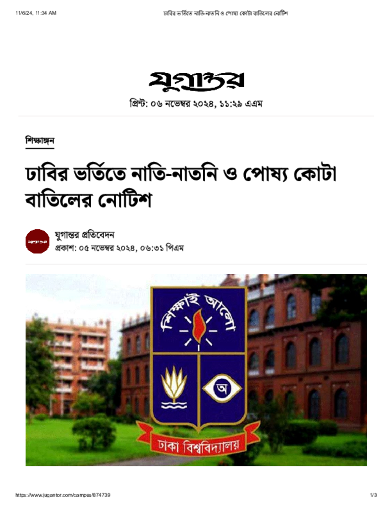 ঢাবির ভর্তিতে নাতি-নাতনি ও পোষ্য কোটা বাতিলের নোটিশ.pdf Published on 05 November 2024 Newspaper দৈনিক যুগান্তর Category General Education General Education Higher Education Public Download
