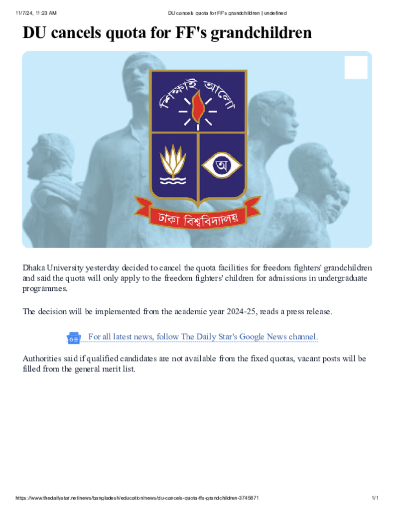 DU cancels quota for FF's grandchildren _ undefined.pdf Published on 06 November 2024 Newspaper The Daily Star Category Admission / Seat Problem General Education Higher Education Public Download