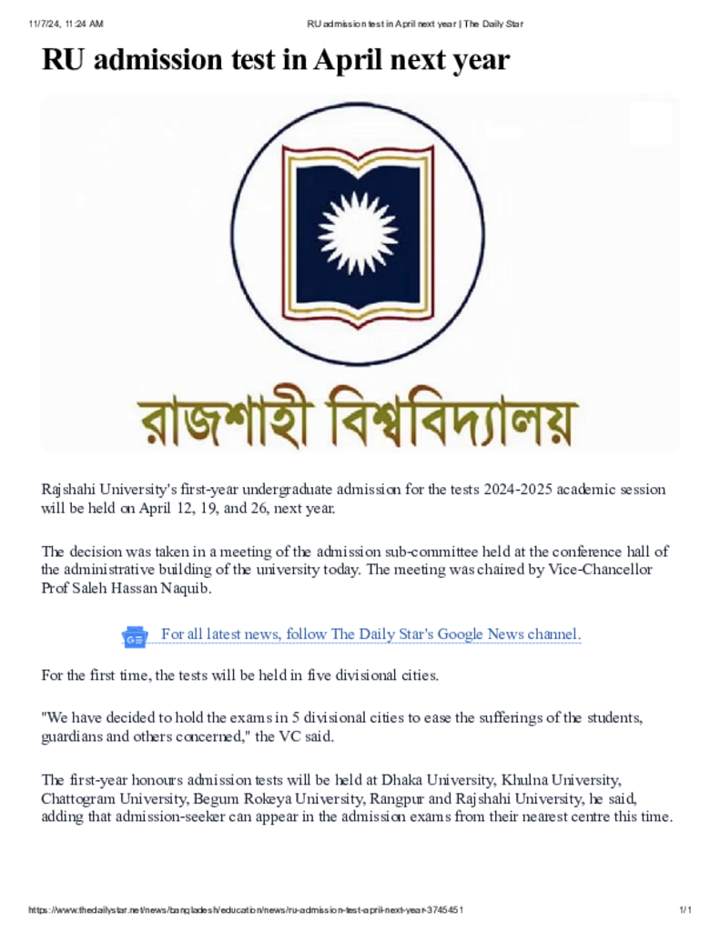 RU admission test in April next year _ The Daily Star.pdf Published on 05 November 2024 Newspaper The Daily Star Category Admission / Seat Problem General Education Higher Education Public Download