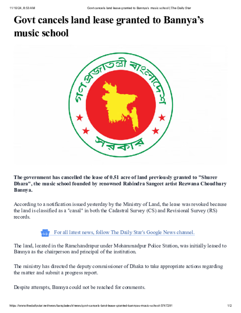 Govt cancels land lease granted to Bannya’s music school _ The Daily Star.pdf